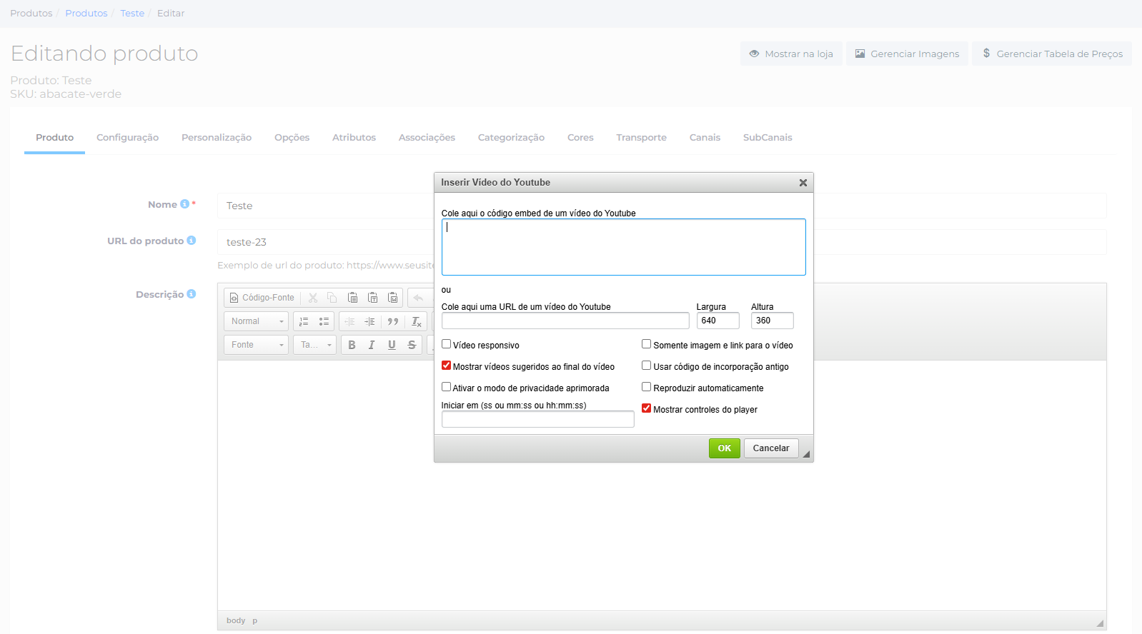 A segunda forma de inserção utiliza vídeos hospedados no YouTube e é realizada diretamente na edição do produto.