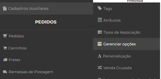 No Painel Administrativo acesse Cadastros Auxiliares > Gerenciar Opções.