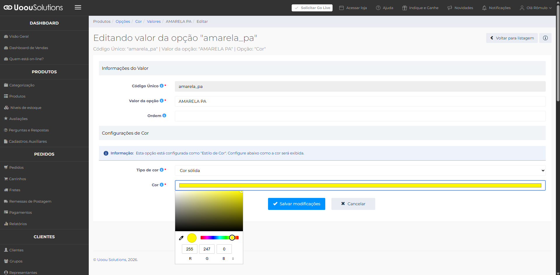Clique no botão Cor e selecione a nova cor desejada. Após, clique em Salvar modificações.