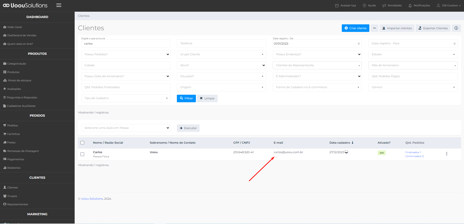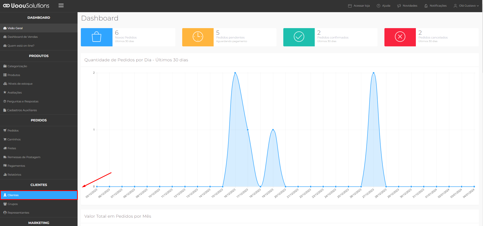 1ºPasso: Com essa informação em mãos, vá até a área administrativa da sua loja virtual e vá no menu "CLIENTES" opção "Clientes".
