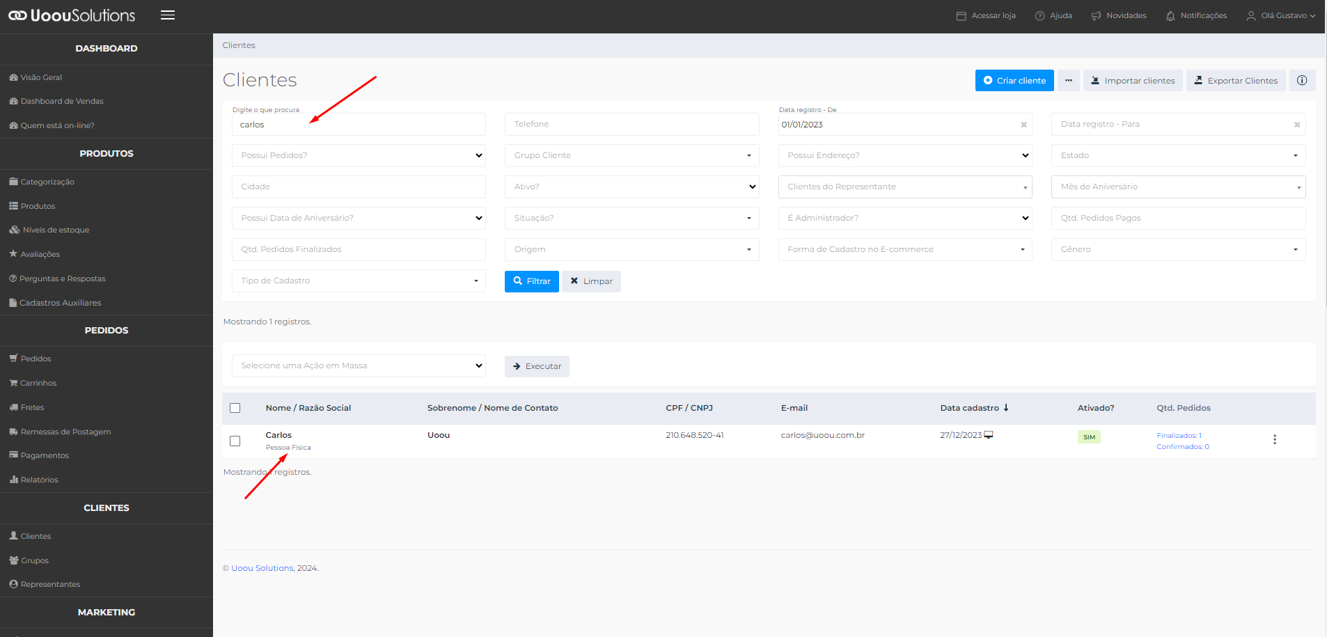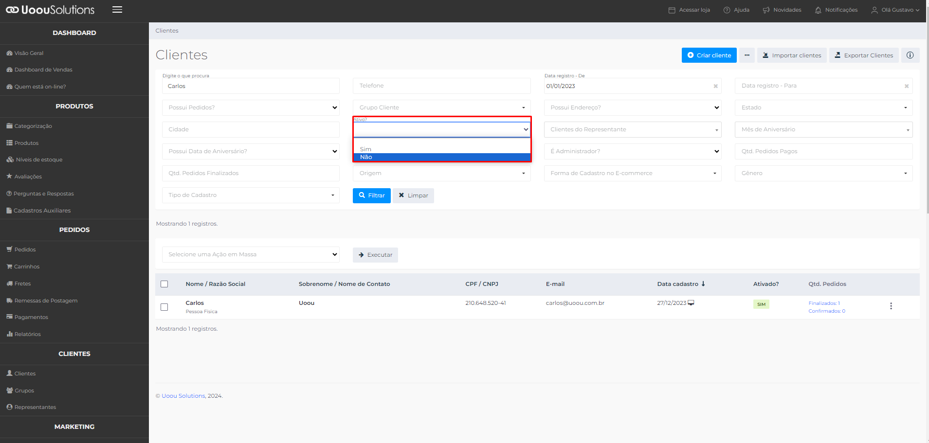Caso não encontre o cadastro do cliente na forma exibida a cima, pode ser que esse usuário tenha sido desativado, para validar essa situação, você pode filtrar por clientes "Ativos", "Inativos", ou ambos, clicando na caixinha em branco: