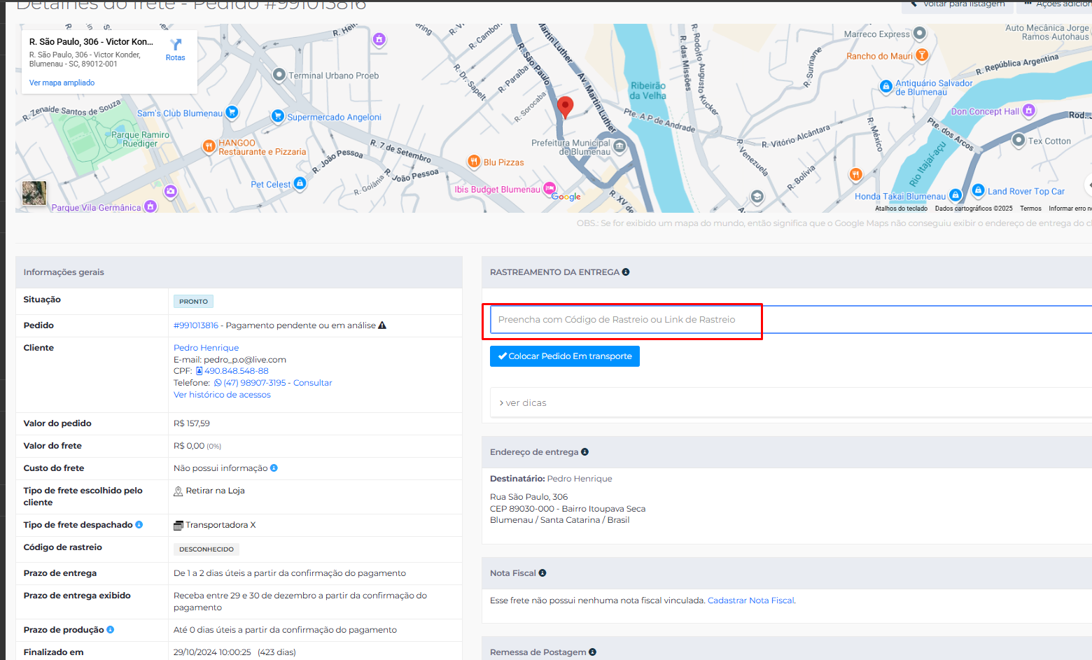 OBSERVAÇÃO: O Link de rastreio apenas será inserido no pedido manualmente caso esteja utilizando algum frete genérico como "Entrega Motoboy" ou relacionado pois em todas as transportadoras o link de rastreio é inserido automaticamente no pedido