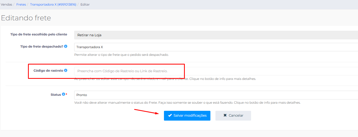 3 - Agora é só inserir o código de rastreio a pós fazer isso clicar em "Salvar Modificações"