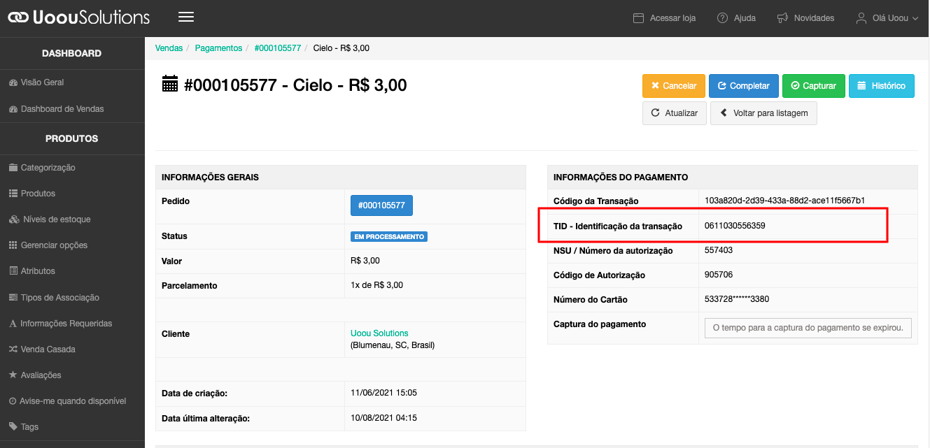 A primeira coisa é saber a TID (Identificação da Transação) que aparecerá na Cielo.
