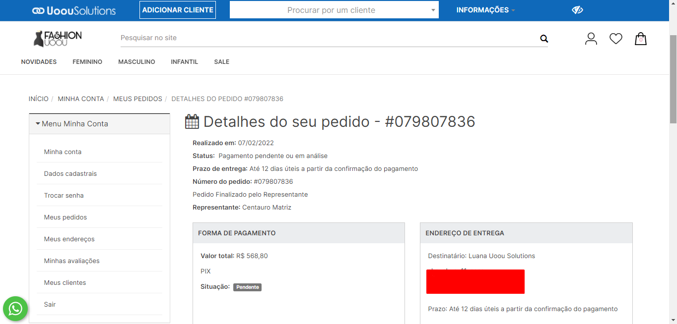 Agora observe o pedido realizado na área do representante: