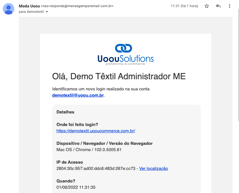 Sempre que um administrador fizer login, você receberá um e-mail com um assunto similar a "Alerta de Segurança - Novo login identificado".