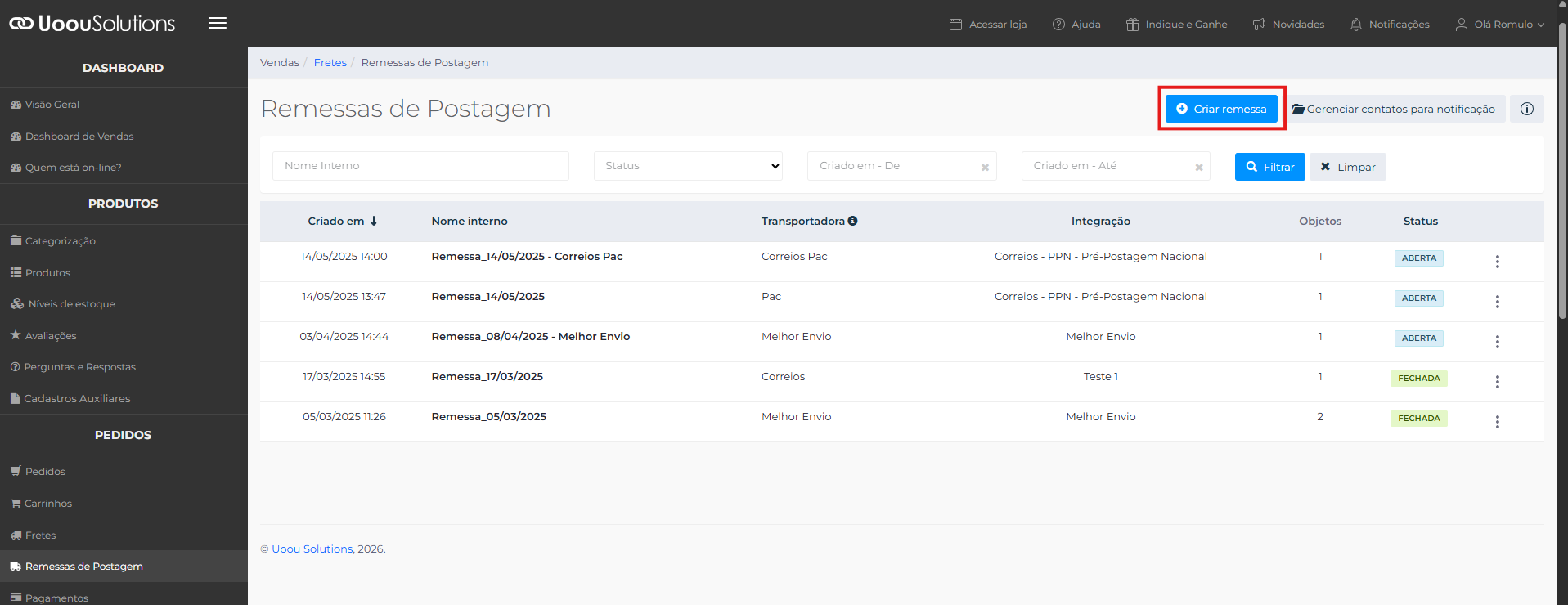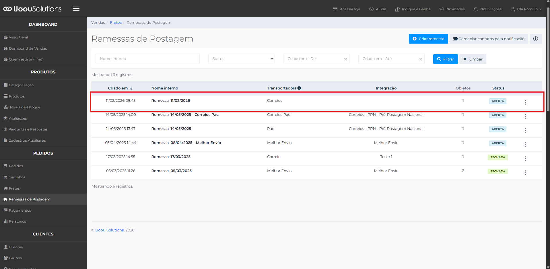 Acesse o menu Remessas de Postagem novamente e selecione a remessa criada.