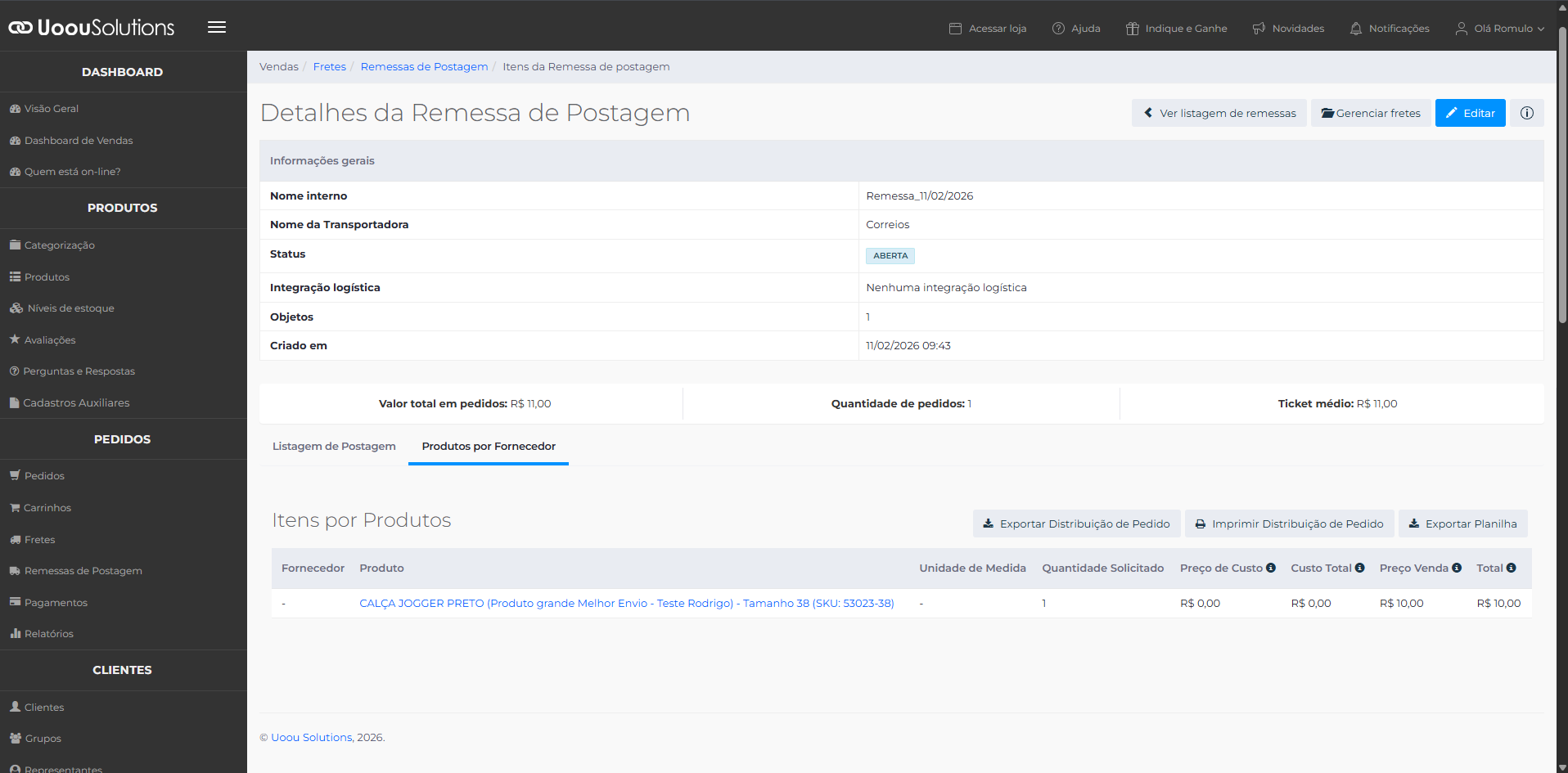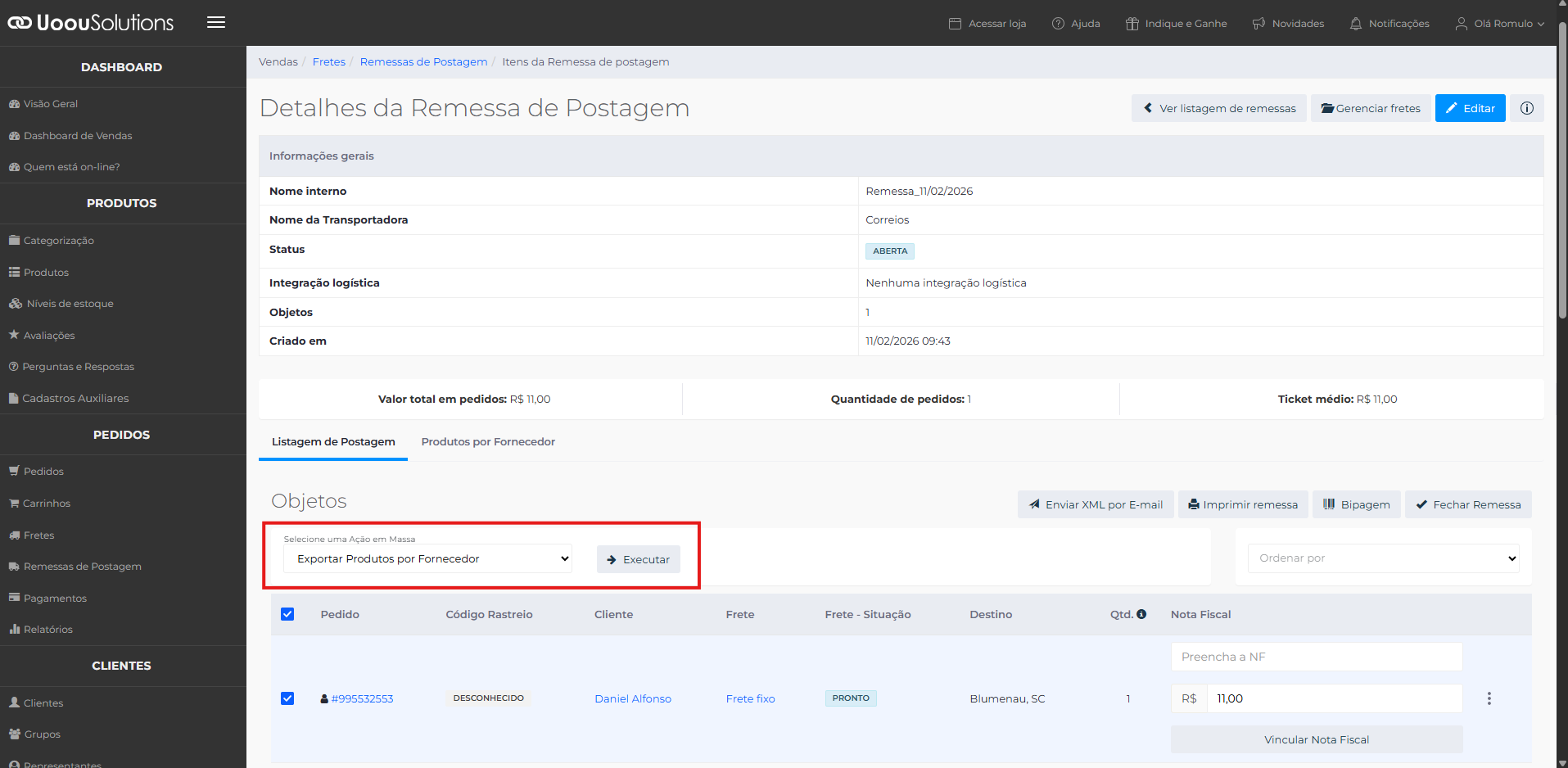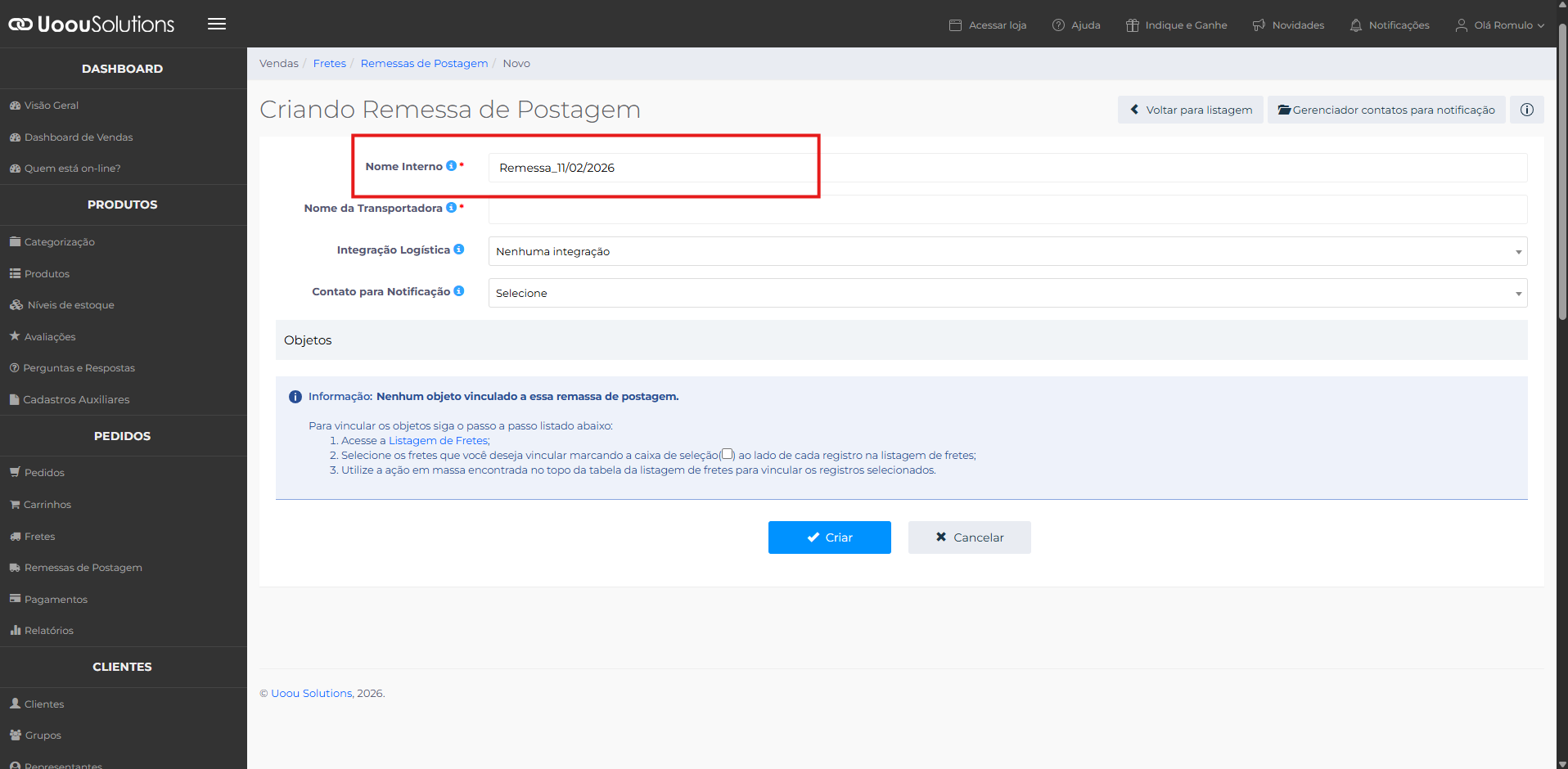 Depois de criar a remessa de postagem, vincule nessa remessa os pedidos que serão despachados juntos.