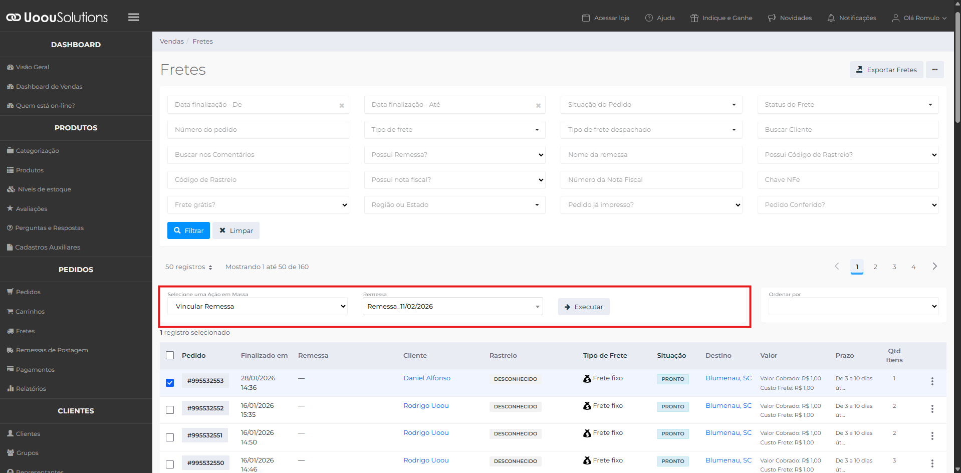 Utilize o campo Ação em massa e selecione Vincular Remessa.