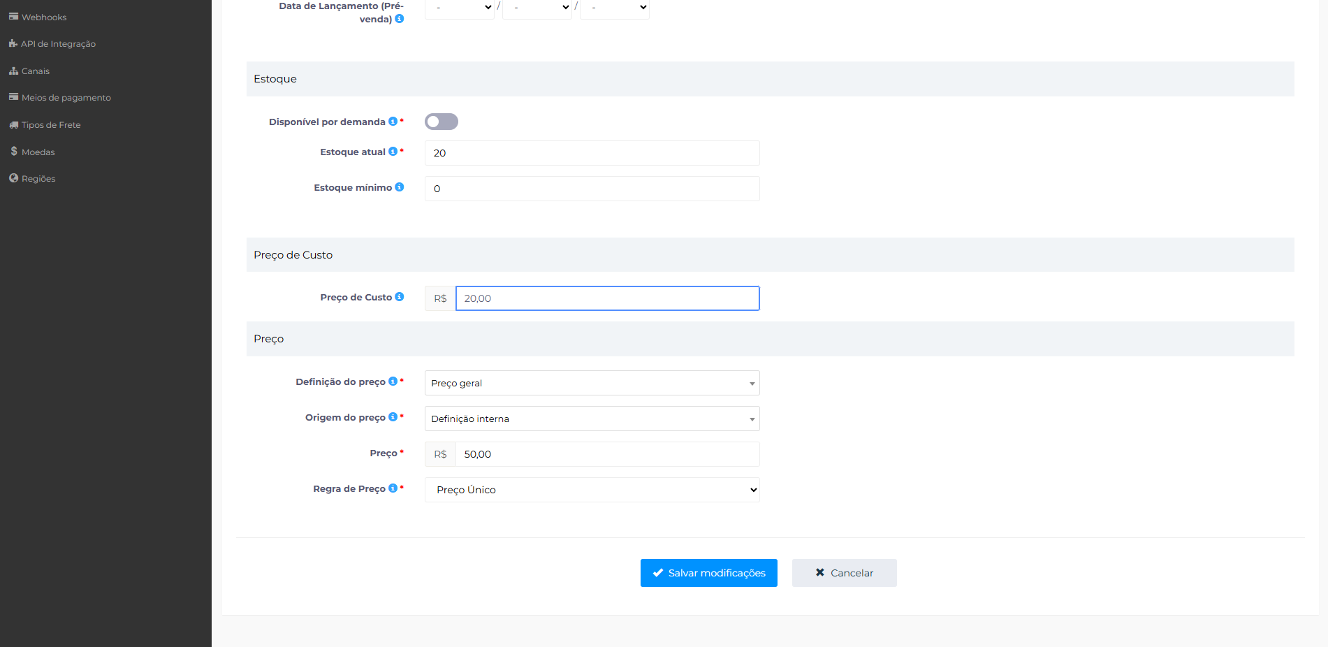 No formulário do produto, role a tela até localizar o campo Preço de Custo.