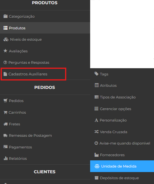 No Painel Administrativo, passe o mouse sobre o menu Cadastros Auxiliares e clique em Unidade de Medida.