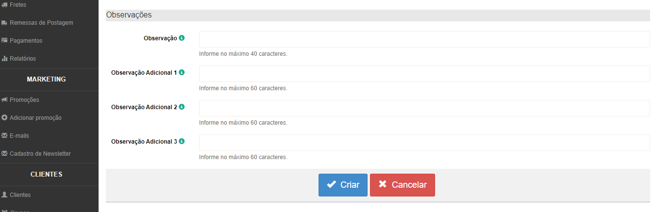 Os campos "Observação", "Observação Adicional 1", "Observação Adicional 2" e "Observação Adicional 3" são espaços disponíveis para enviar uma linhas de mensagens única por pedido ou um parâmetro indicando qual observação você quer apresentar.