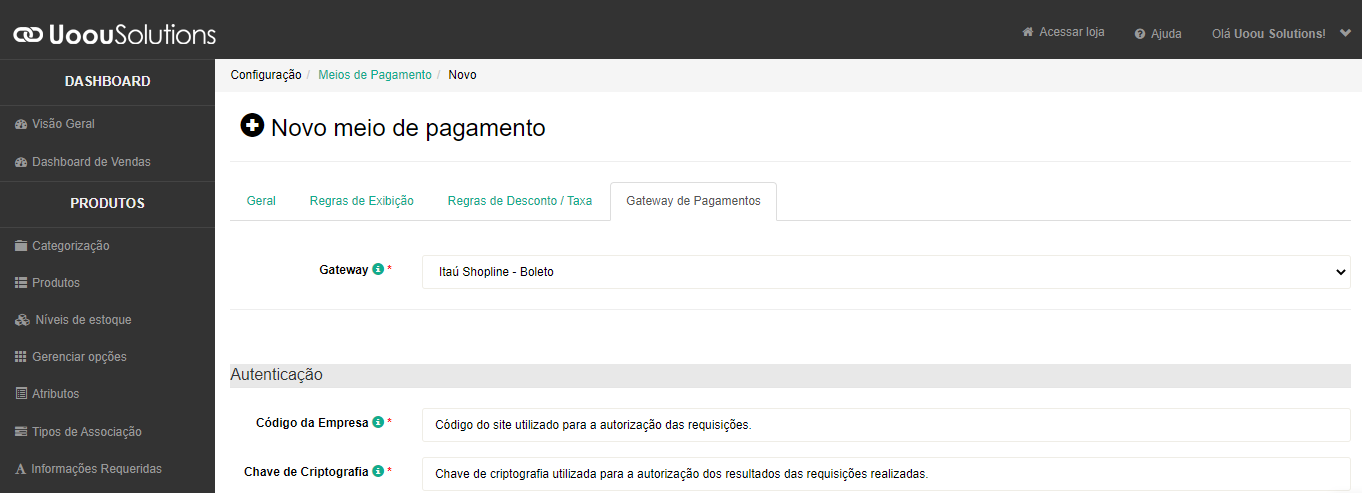 Em "Gateway" escolha a opção "Itaú Shopline - Boleto", depois vamos separar a tela de gateway em duas partes, "Autenticação'', "Expiração" e "Observações".