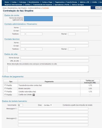2º Passo: Dentro do painel administrativo da sua conta, clique em "Recebimentos", depois vá em "Itaú Shopline - Comércio eletrônico" e clique em "Contratar".