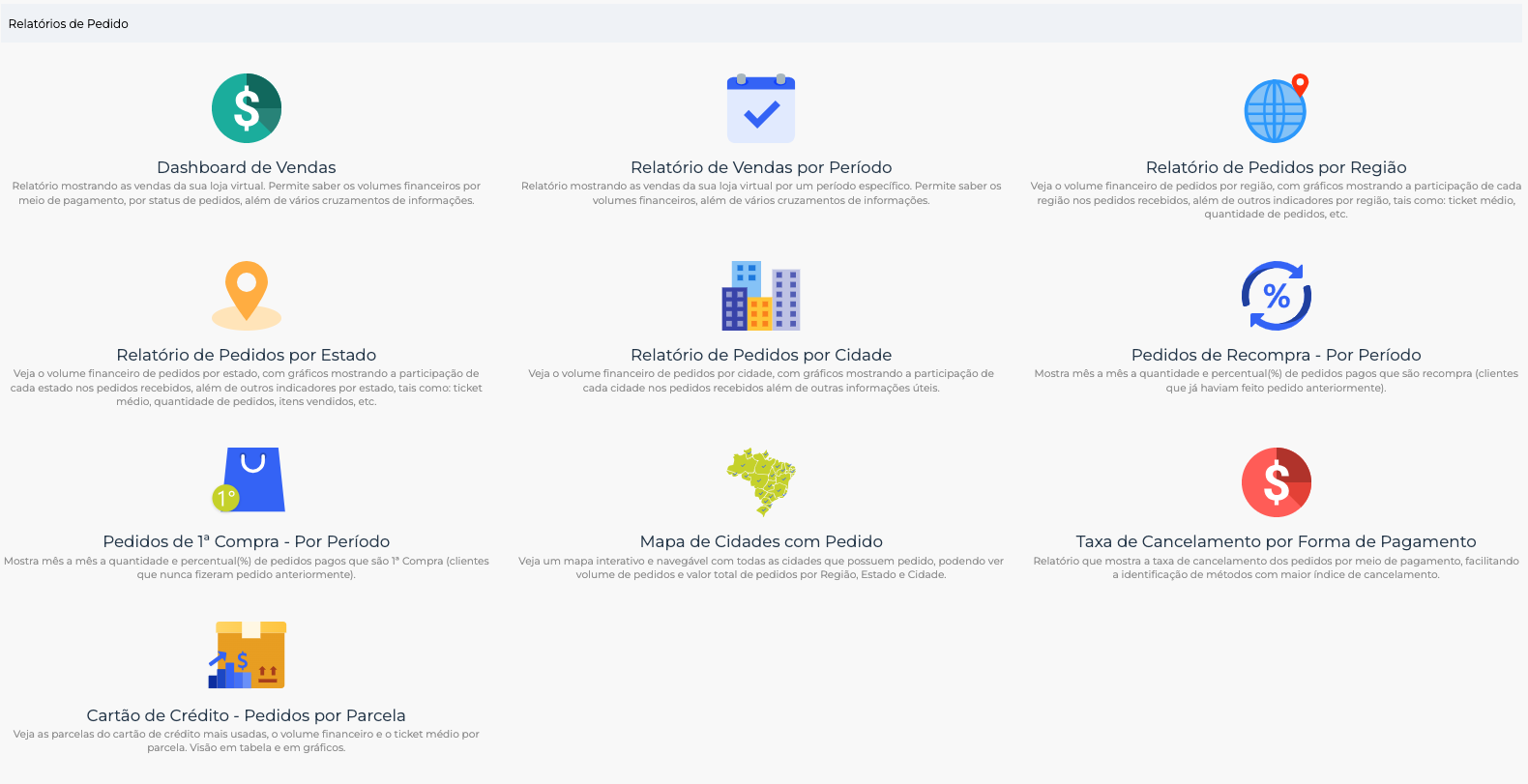 Promoções e cupons: filtra pedidos que utilizaram promoções ou cupons de desconto.
