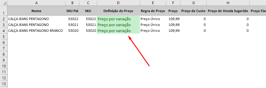 2. Atualize a definição do preço: Ao abrir a planilha, você encontrará uma coluna chamada "Definição do Preço" com o valor "Preço Geral". Substitua esse valor por "Preço por variação". Essa alteração indicará que os preços serão definidos individualmente para cada variação de produto.