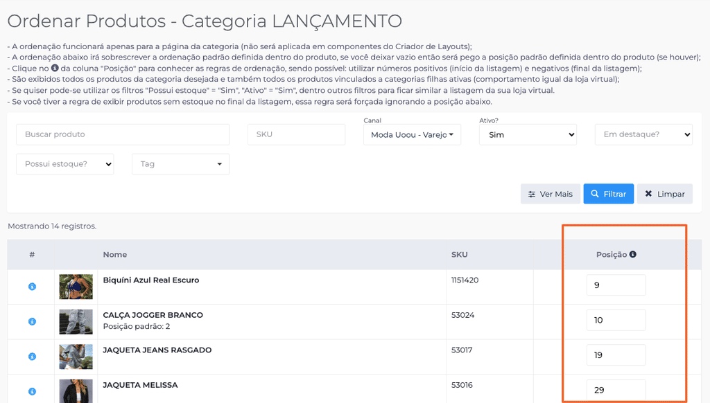 A ordenação manual sobrescreve a ordenação padrão do produto, caso o campo Posição esteja preenchido.
