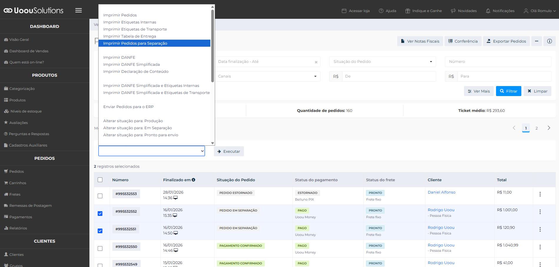 A impressão para separação pode ser realizada diretamente na tela de listagem de pedidos por meio de uma ação em massa.