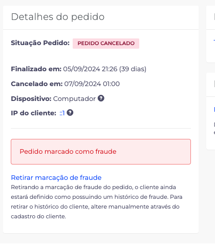 - Visibilidade clara no pedido: Assim que um pedido é marcado como fraude, ele será destacado na listagem e nos detalhes do pedido.