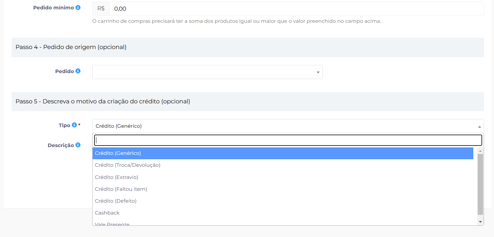 2. Especifique a razão para a criação do crédito, garantindo um histórico mais detalhado para controle interno.