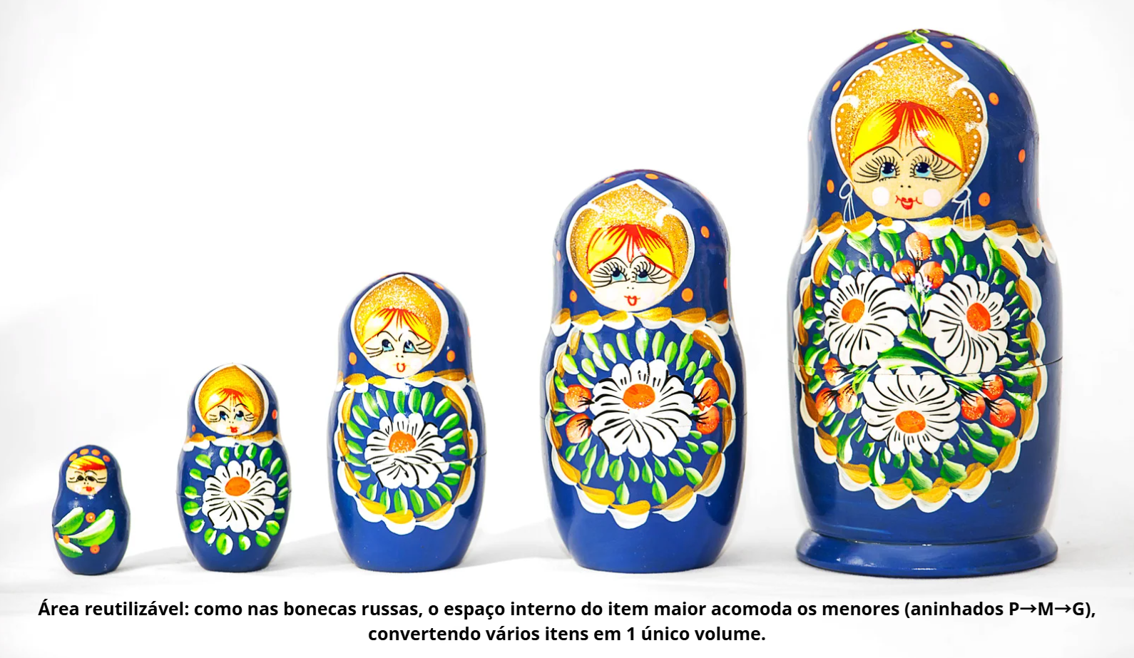 Menos volumes, menor custo: itens “encaixáveis” (ex.: malas P dentro da M e da G) passam a ser simulados no mesmo volume.