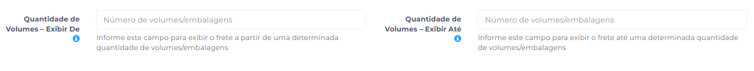 Foram criados dois novos campos para definir a visibilidade do frete conforme a quantidade de volumes/embalagens do pedido: preencha os intervalos “De” e “Até”.