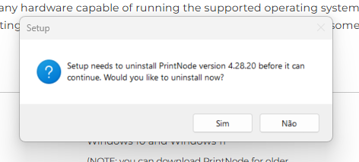 Se o instalador novo mostrar a janela “Setup needs to uninstall PrintNode version …”, clique Sim.