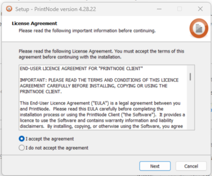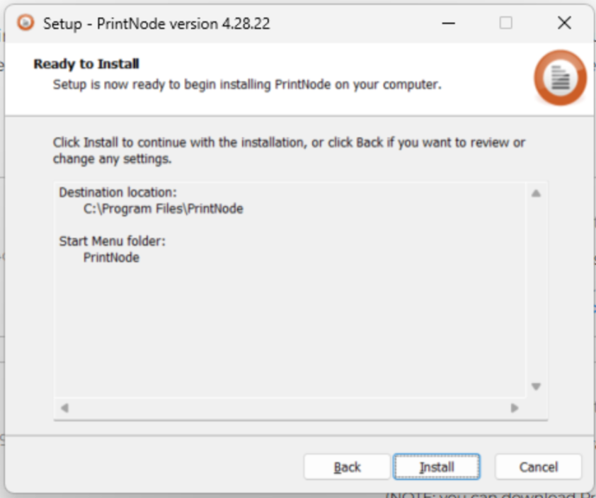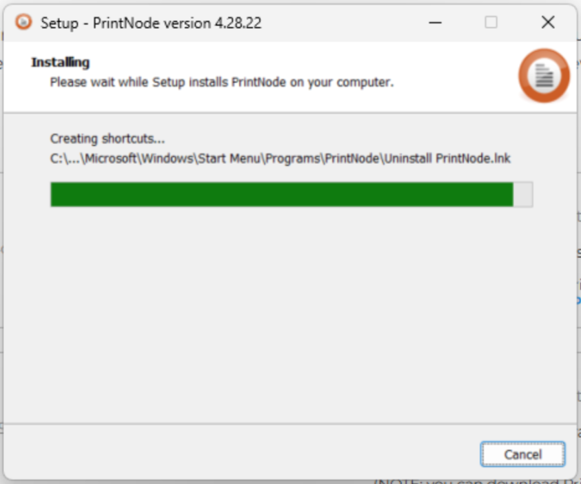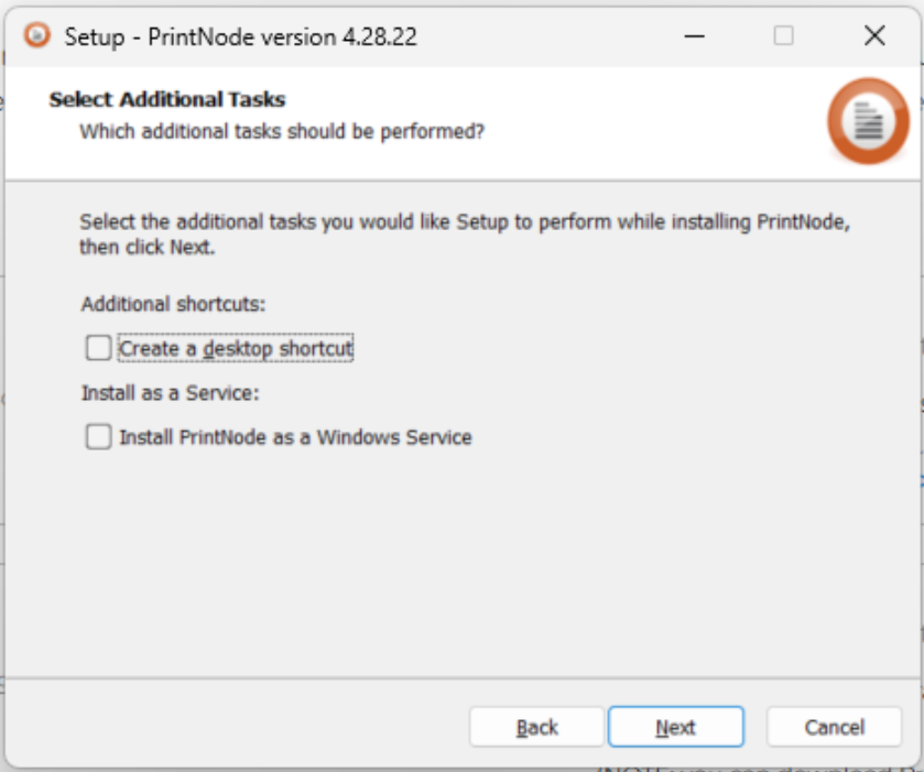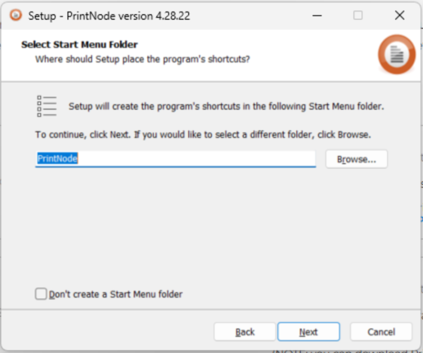 Atalhos do menu Iniciar → mantenha “PrintNode” e Next.
