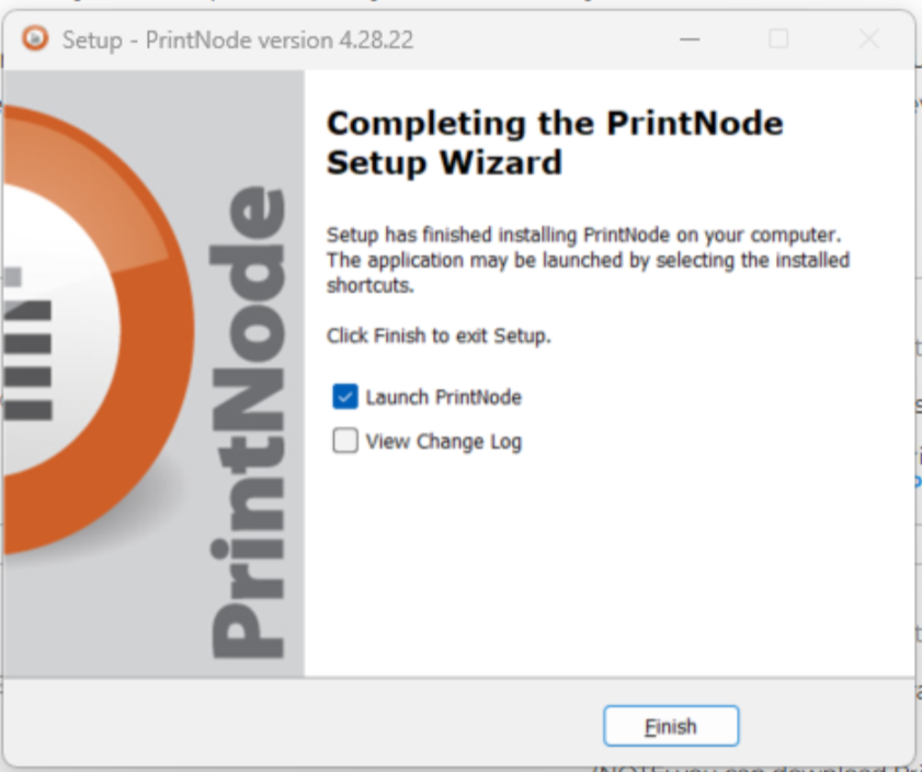 Conclusão: deixe Launch PrintNode marcado e Finish.