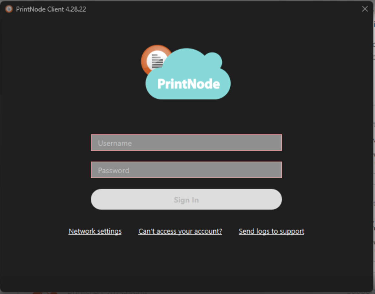Na tela de login do cliente, informe Username e Password da sua conta PrintNode e clique Sign In.