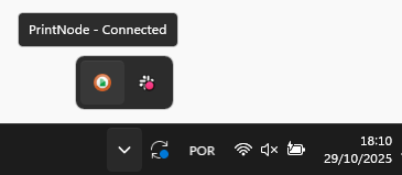 Bandeja do sistema: o ícone do PrintNode (nuvem) aparece colorido/ativo e não mostra erro.