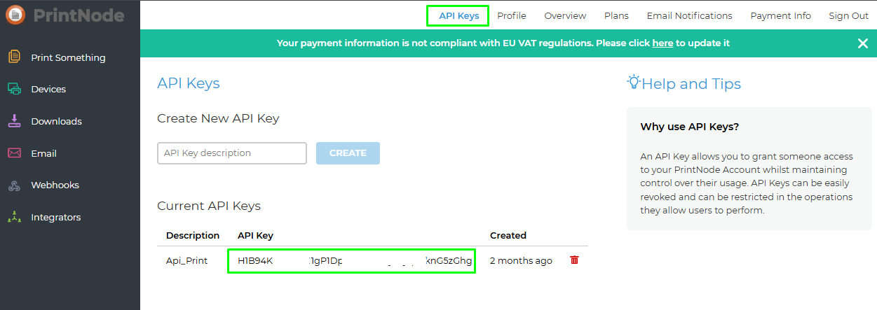 Na conta PrintNode, gere uma API Key (Account → API Keys → Generate).
