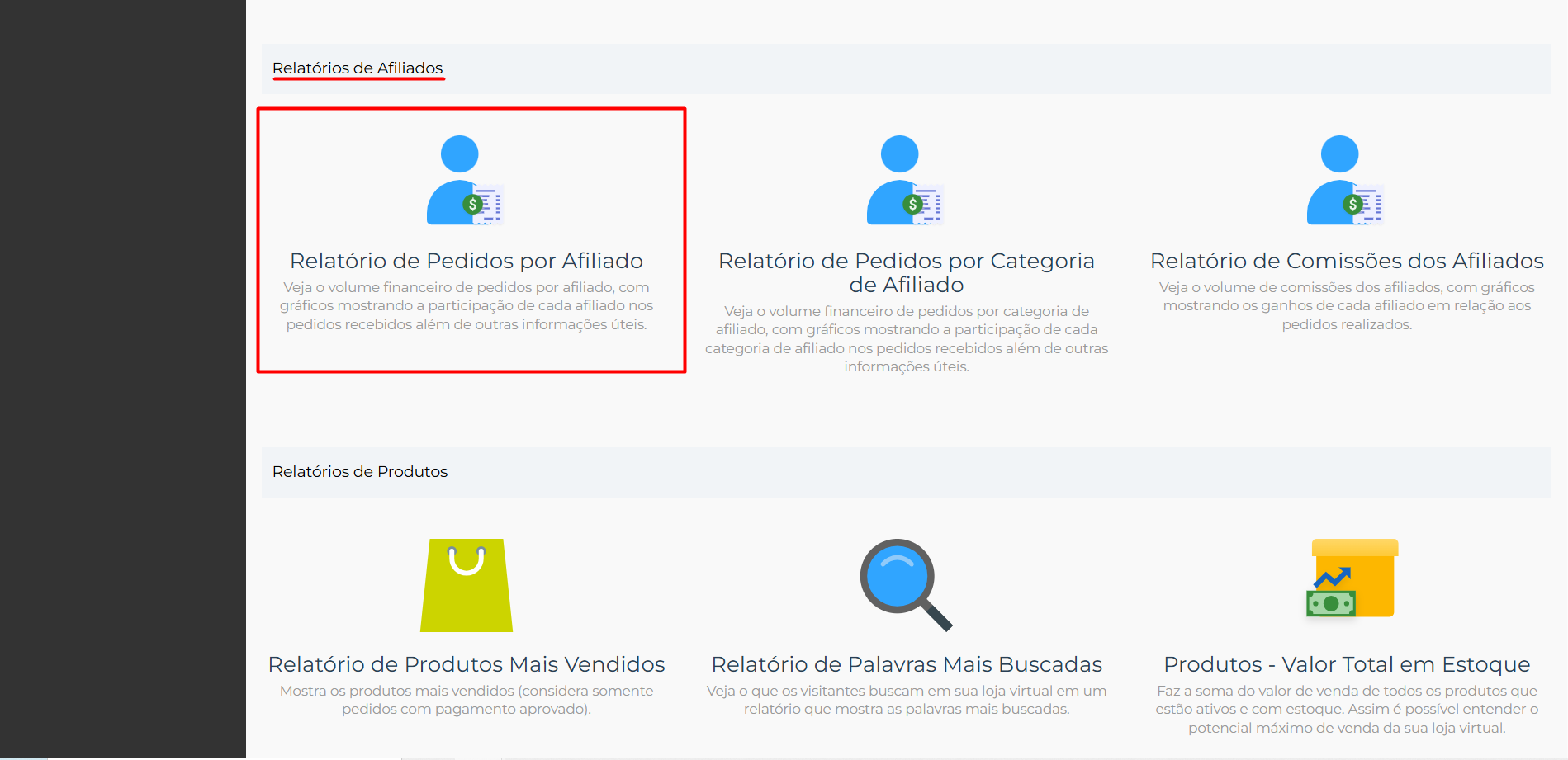 - Nesta janela há diversos tipos de relatórios, desça até achar a categoria 'Relatórios de Afiliados' e clique em 'Relatório de Pedidos por Afiliado'