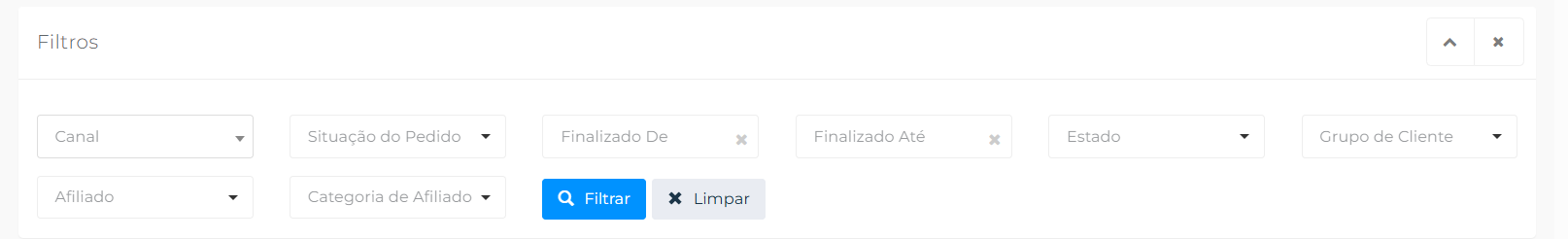 Finalizado de/até - Caso você queira filtrar pedidos finalizados em um intervalo de dias específicos, você pode selecionar a data inicial no campo 'Finalizado de' e a data final em 'Finalizado Até'.