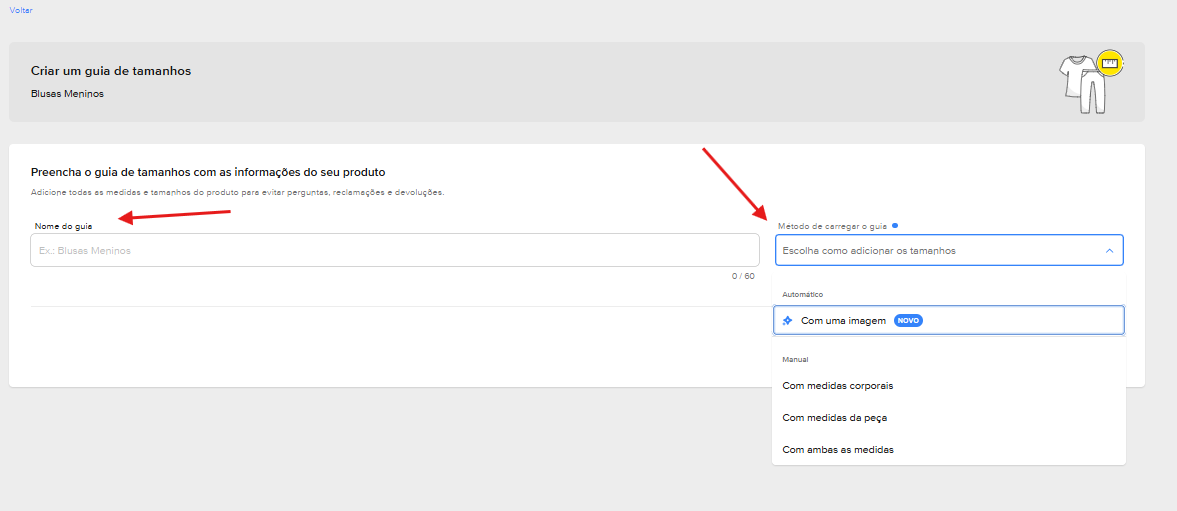 Agora sabemos que a devemos criar dentro do Mercado Livre uma grade de tamanhos para o gênero ''menino'' e a categoria ''Blusas''