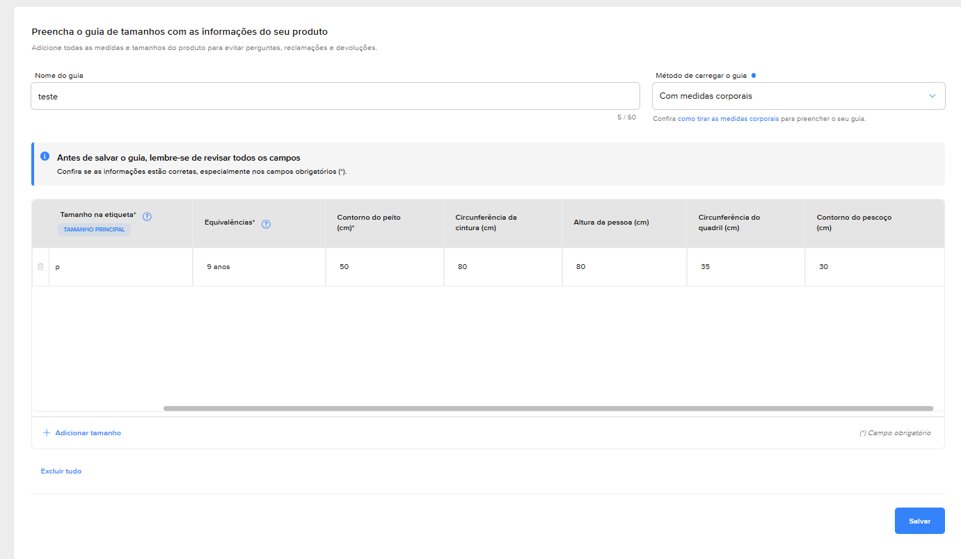 Finalize cadastrando os tamanhos das suas peças para essa categoria: