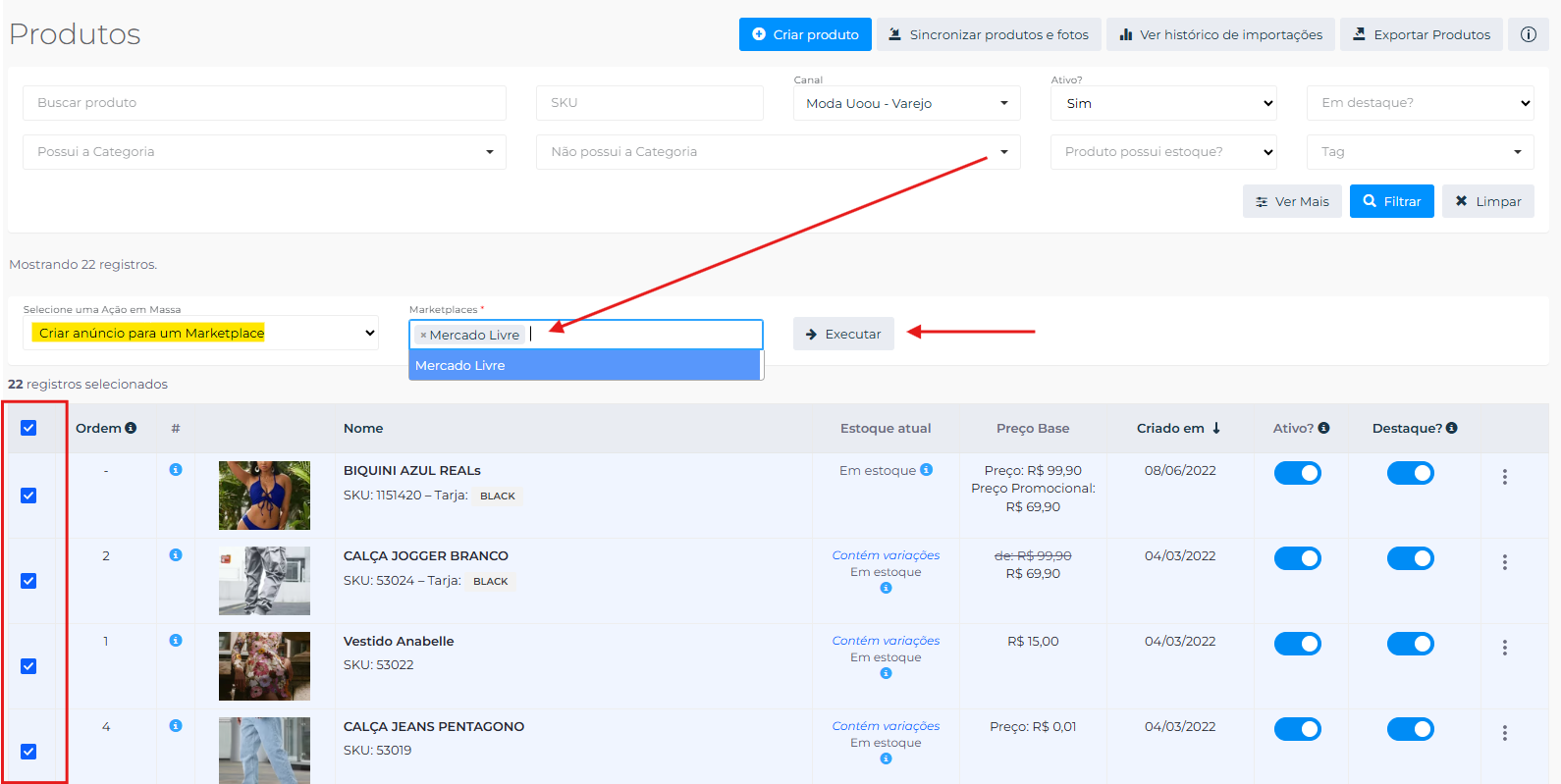 Para enviar mais de um produto para a tela de ''Anúncios'' você pode realizar a ação em massa ''Criar um anuncio para um marketplace'' e definir qual marketplace você deseja enviar esse anúncio. Após isso basta clicar em ''Executar'' que os produtos selecionados aparecerão na tela de ''Anúncios''.