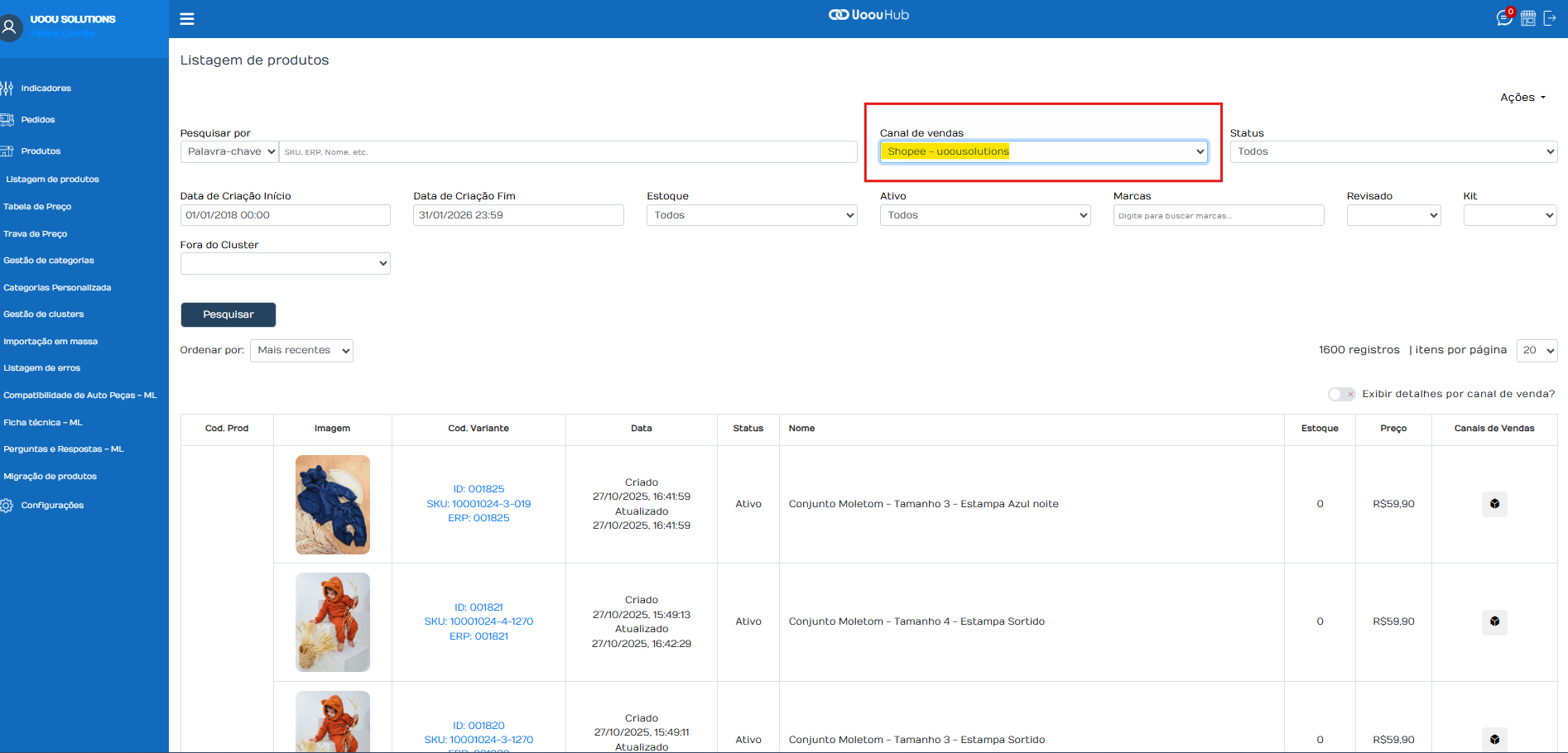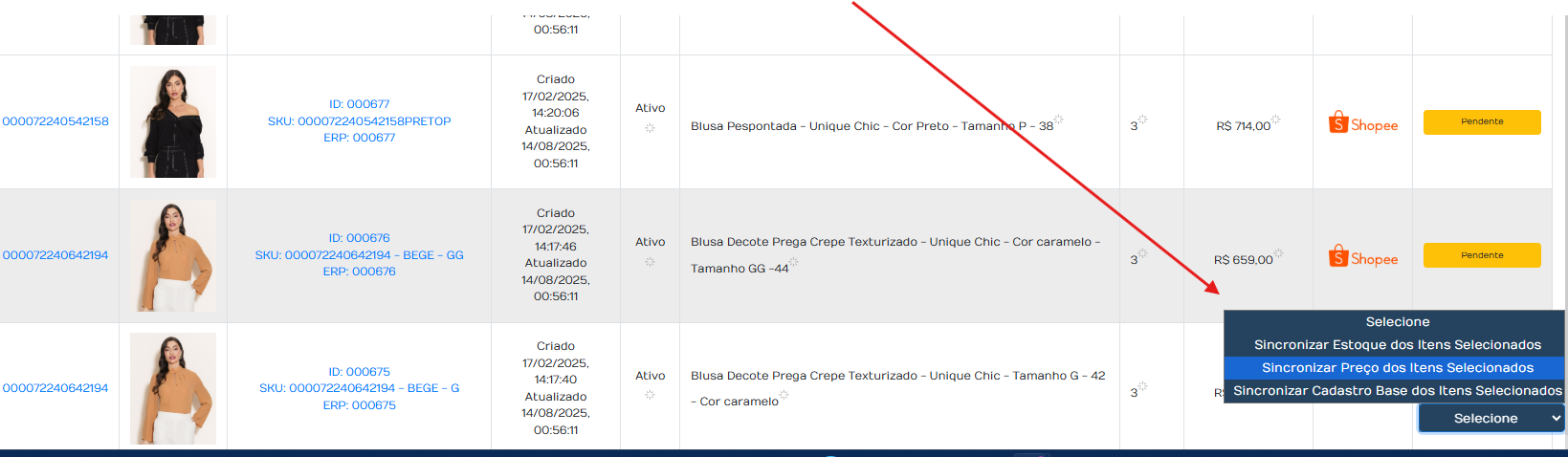 Após isso, defina o canal de venda que deseja forçar a atualização. No meu caso, vou forçar a atualização na Shopee: