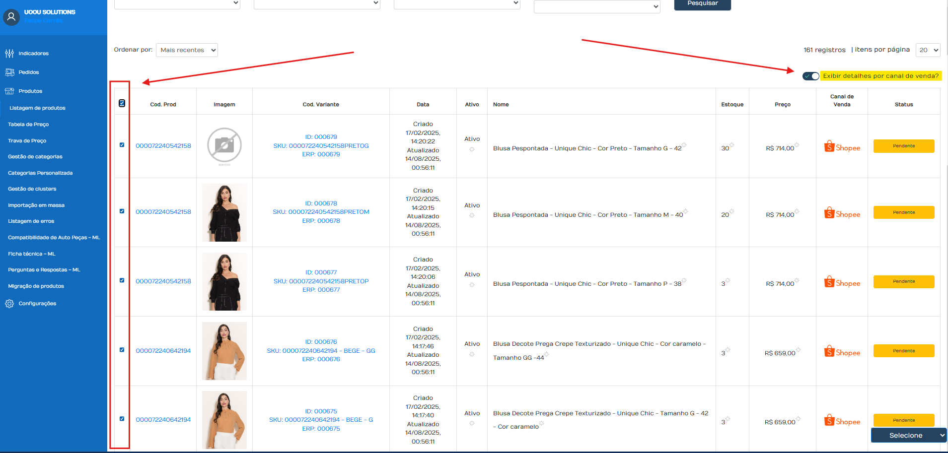 Em seguida, marque a opção ''Exibir detalhes por canal de venda?'' e selecione os produtos que deseja forçar a atualização: